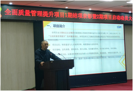 方圓標志認證集團河南有限公司助力企業(yè)高質(zhì)量發(fā)展3月8日,河南金丹乳酸科技股份有限公司(以下簡稱“金丹乳酸”)召開了全面質(zhì)量管理提升項目一期結(jié)項表彰暨二期項目啟動動員大會。董事長張鵬、副總經(jīng)理崔耀軍等公司領(lǐng)導(dǎo),各部門及車間負責人、體系管理員及..