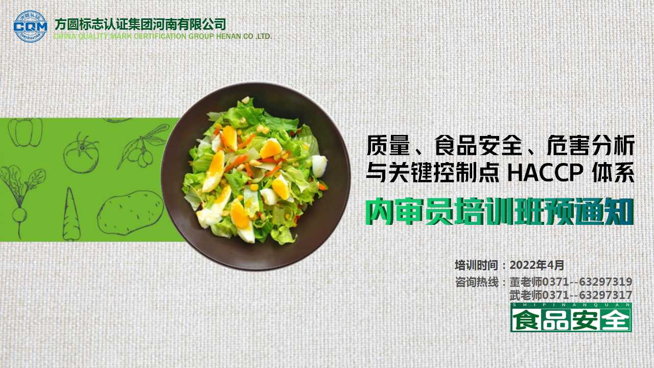 關于舉辦質量、食品安全、危害分析與關鍵控制點HACCP體系內審員培訓班的預通知